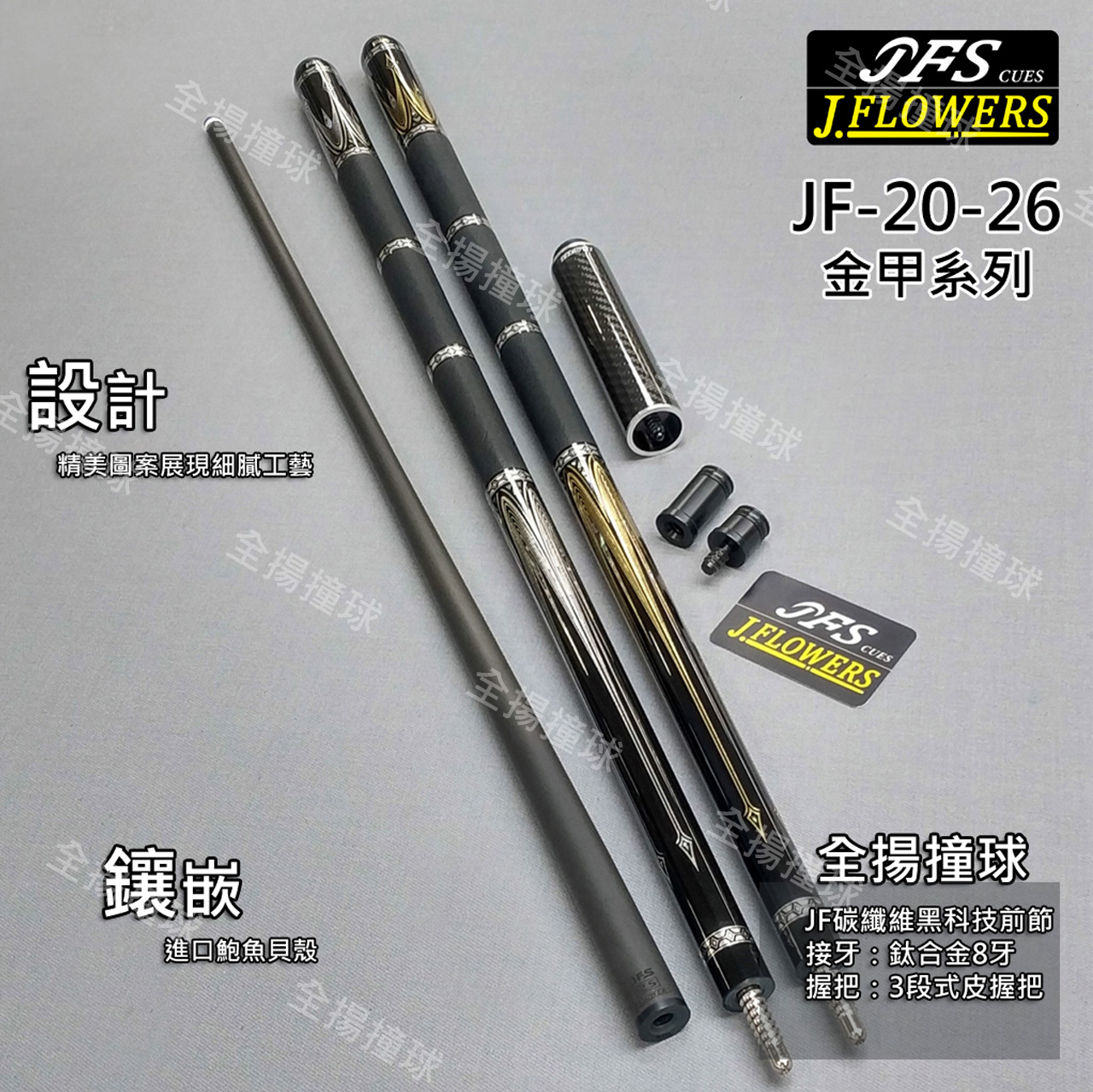 全揚撞球 JFLOWERS【JF20-26-金甲系列-3段式皮握把】8牙-撞球桿-黑科技撞球桿